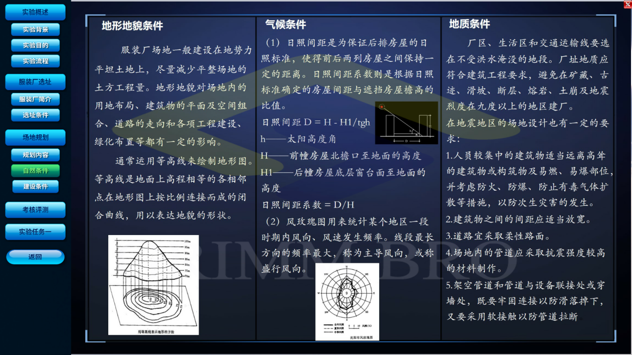 实验以"场景沉浸-任务驱动-动态验证-智能反馈"为逻辑主线。在设计概况阶段,学生通过交互式视频与地理信息系统模拟,直观理解服装厂选址的六大核心要素——从市场辐射半径、物流成本到人才吸引力的量化关联,配合10道情景化测试题实现即时知识校验,夯实规划基础认知。