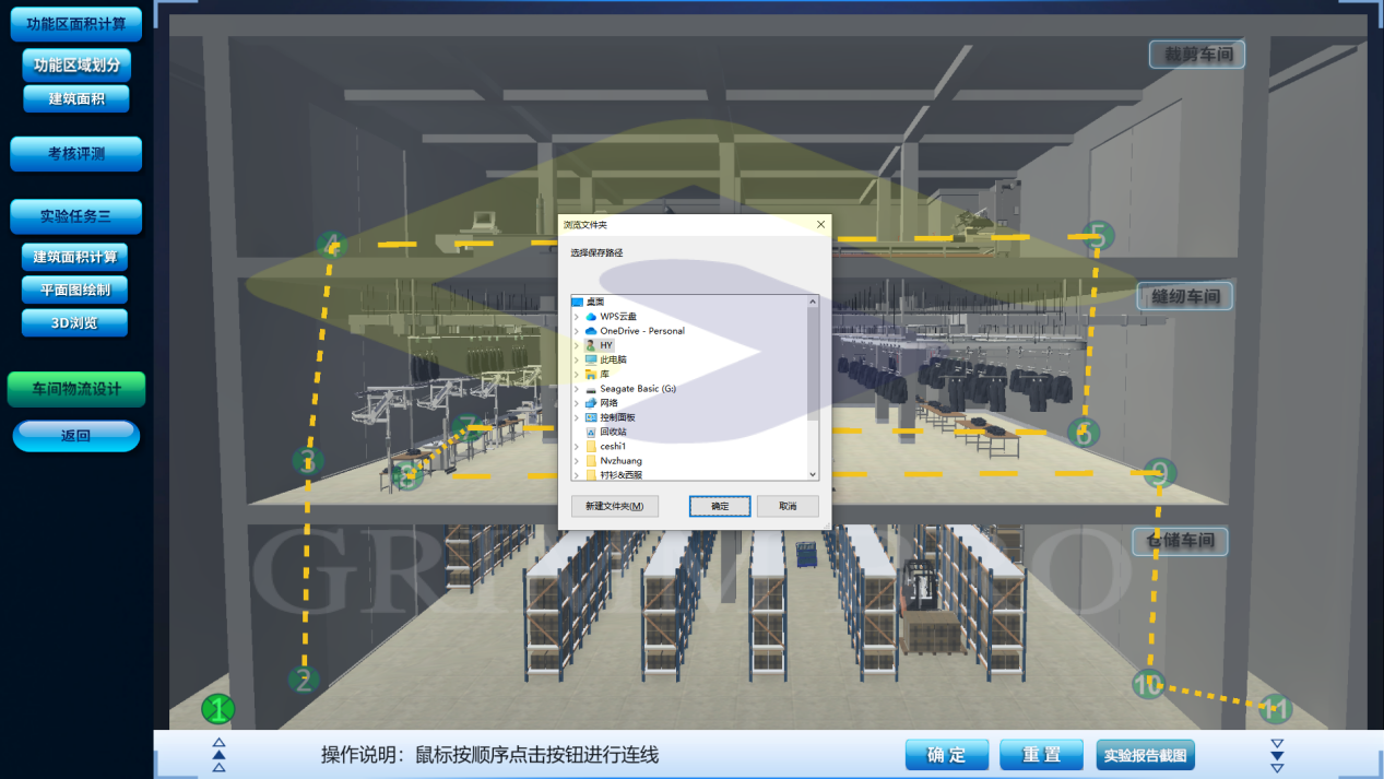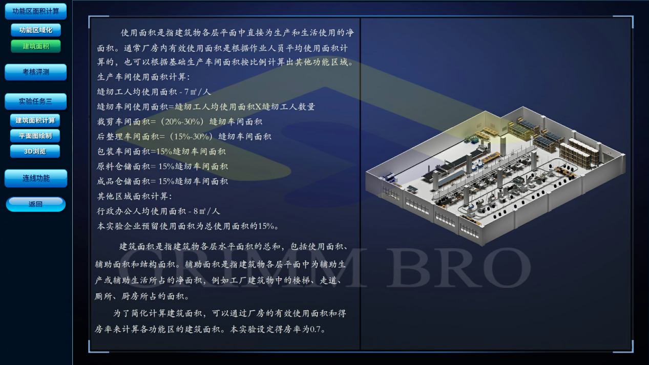 核心实践环节聚焦厂区规划的数字化设计。实验提供智能面积计算工具与16类3D建筑模型库,支持学生自主规划生产车间、仓储区、办公区的空间布局。通过物流路径连线功能验证原料-成品流通效率,借助3D漫游功能实现多视角设计审查,配合建筑面积精准计算任务,形成"设计-验证-优化"的实践闭环,强化空间规划的系统性思维。