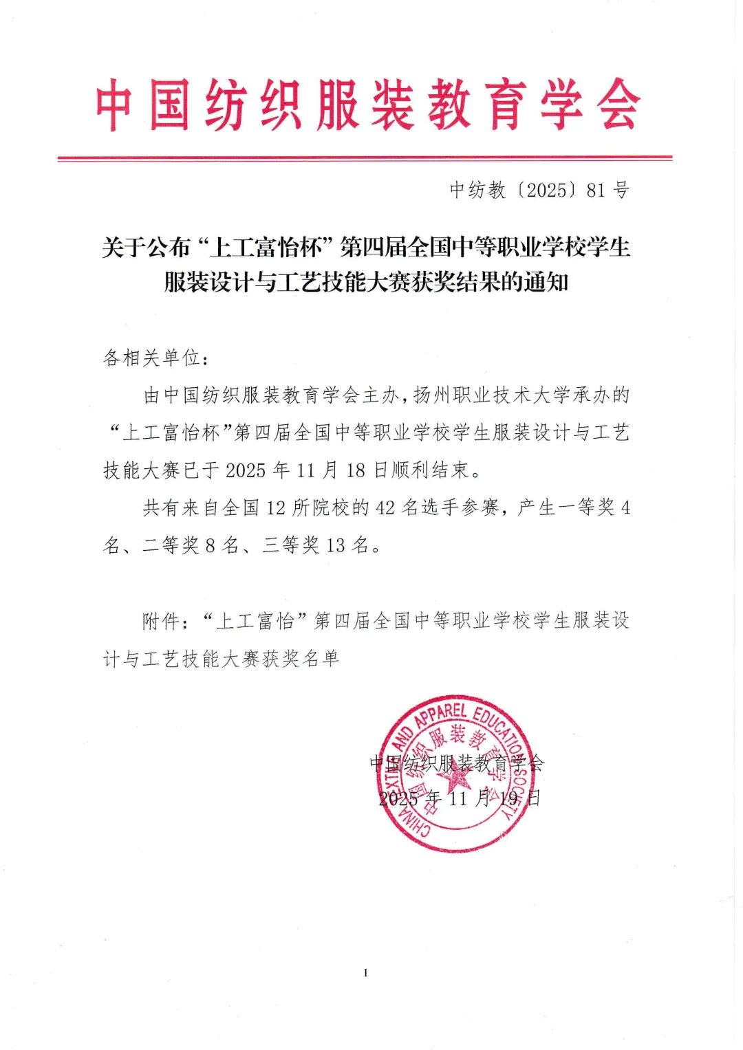 2025年11月19日,中国纺织服装教育学会发布了“关于公布“上工富怡杯”第四届全国中等职业学校学生服装设计与工艺技能大赛获奖结果的通知”。