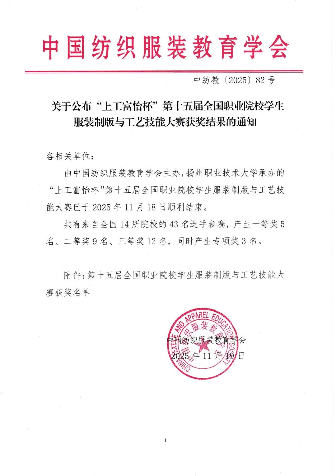 2025年11月19日,中国纺织服装教育学会发布了“关于公布“上工富怡杯”第十五届全国职业院校学生服装制版与工艺技能大赛获奖结果的通知”。