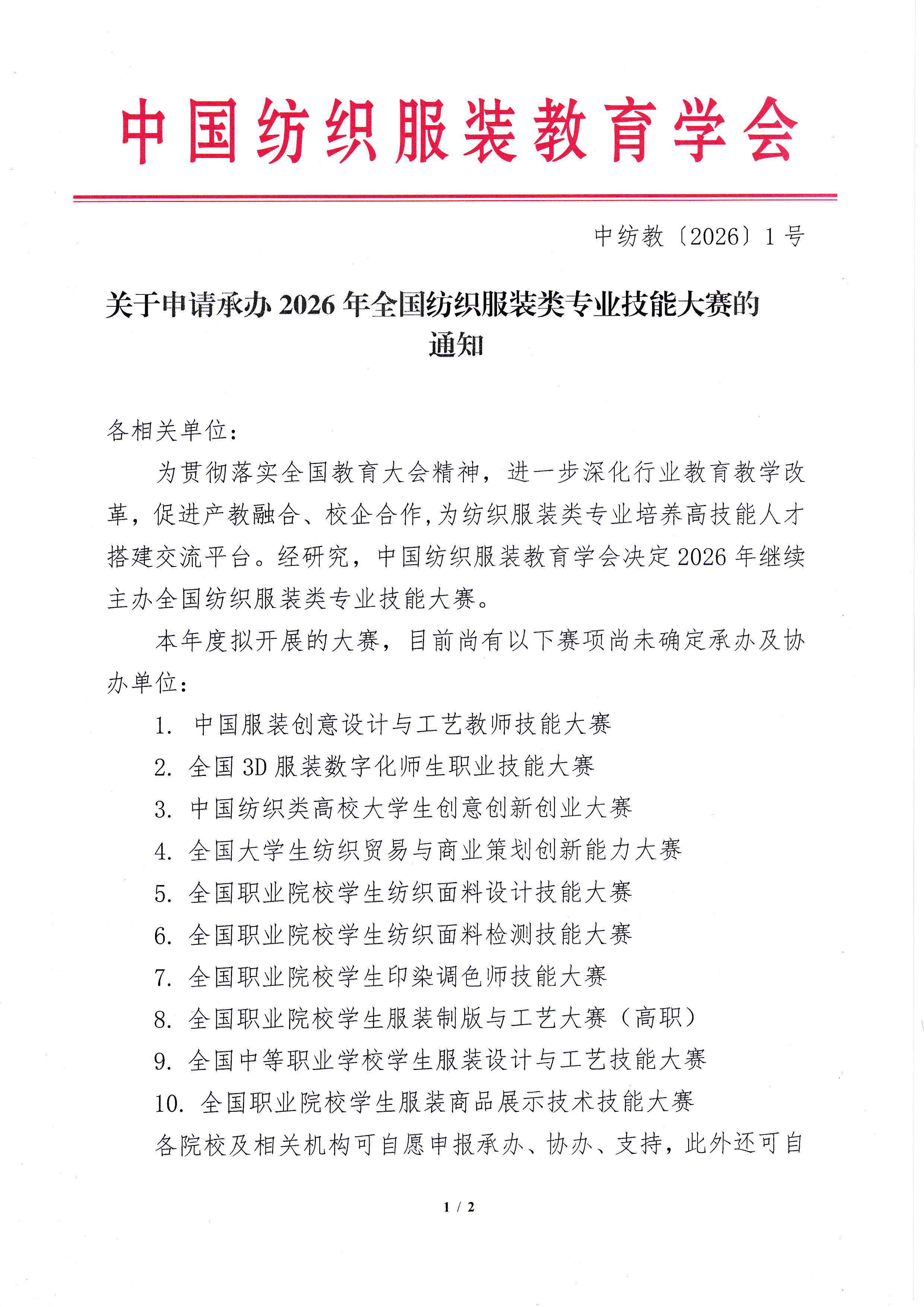 2026年1月12日,中国纺织服装教育学会发布了“关于申请承办2026年全国纺织服装类专业技能大赛的通知”。
